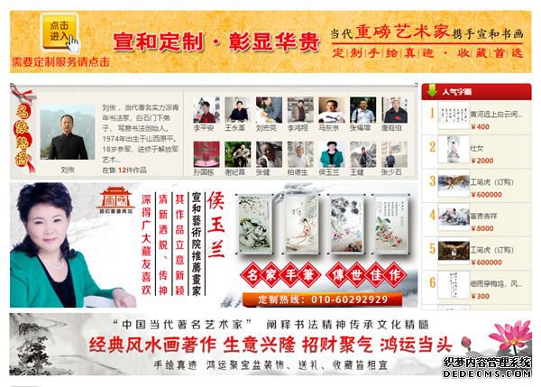 北京宣和书画艺术研究院旗下,宣和书画商城(www.xuanheart.com)和环球文化收藏(www.hqwhsc.com),是拥有以北京书画市场为根基,辐射全国书画艺术界的新网络营销平台。