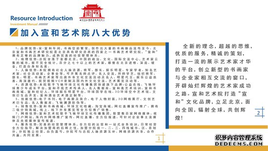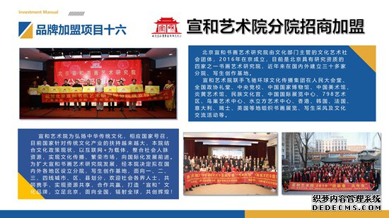 1、品牌优势:宋·宣和年间,书画空前繁荣,创作出大量的书画臻品流传至今。北京宣和书画艺术研究院是北京具有研究资质的四家之一书画艺术研究院,“宣和”拥有足够的品牌魅力,成熟完善的经营管理体系。