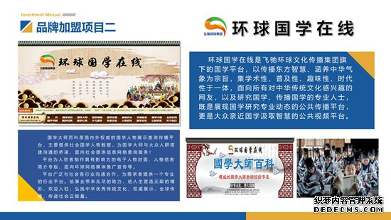 飞驰环球集团旗下拥有各类品牌项目涵盖文化艺术、餐饮行业、飞驰环球视频、环球直播、宣和艺术院、宣和斋培训、拜师学艺、环球文创、环球国学、国学百科、名人数据库、公益在线、3D展馆、环球收藏、成长平台、宣和洞藏酒、飞驰溯源、环球娱乐、环球名人俱乐部等为创业者量身打造的创业项目,让创业者实现自己的商机,实现您创业的梦想,开拓自己的事业,打造属于自己的平台。