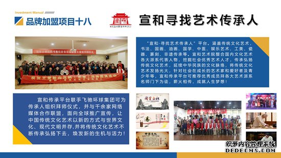 飞驰环球集团旗下拥有各类品牌项目涵盖文化艺术、餐饮行业、飞驰环球视频、环球直播、宣和艺术院、宣和斋培训、拜师学艺、环球文创、环球国学、国学百科、名人数据库、公益在线、3D展馆、环球收藏、成长平台、宣和洞藏酒、飞驰溯源、环球娱乐、环球名人俱乐部等为创业者量身打造的创业项目,让创业者实现自己的商机,实现您创业的梦想,开拓自己的事业,打造属于自己的平台。