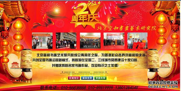 宣和艺术院是北京市具有学术研究资质的六家艺术研究院之一,目前已在国内敦煌、兰州、张掖、银川、南京、吉林、张家口、廊坊、蓟州等地建立多家分院和写生创作基地,拥有千余名书画艺术家资源,多次组织国际书画展览、写生等活动,与百余家媒体长期保持密切的合作关系,并自主开发了3D艺术展厅,溯源防伪系统等,宣和书画商城、环球文化收藏及三级分销微信小程序销售会员作品,同时也开展分院少儿艺术培训工作,优秀的名家教师资源互动。得到了社会各界的广泛认可和好评,在书画领域有着较高的声誉和良好口碑。