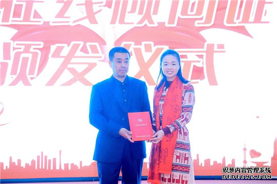 许顺喜向陈爱莲(秘书代领)颁发公益在线名誉站长证书